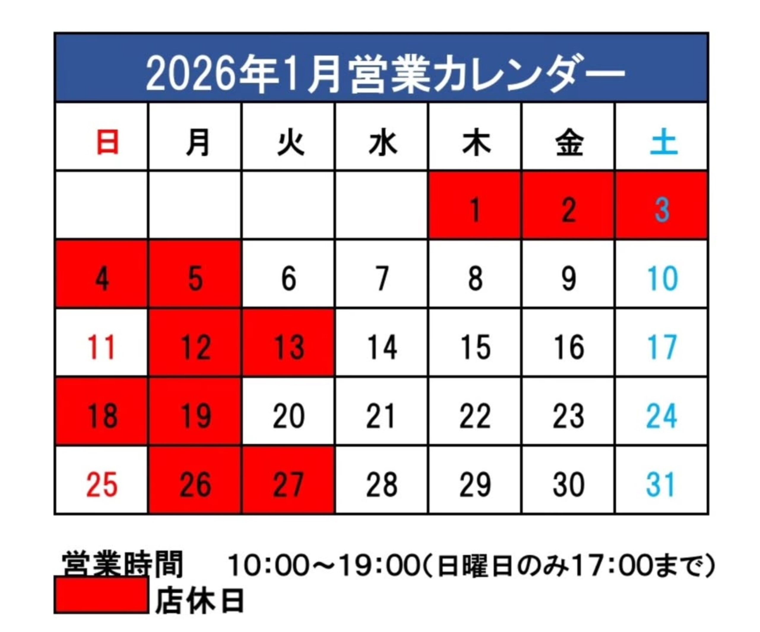 1月営業日カレンダー 2026年1月11日 最終更新日時 : 2026年1月11日 webm 毎週月曜日、第二・第四火曜日の定休日に加え、18日(日)ビル全館停電点検のため臨時休業となります。 ご来店予定の皆様、ご不便をお掛けしますが宜しくお願い申し上げます。 Screenshot